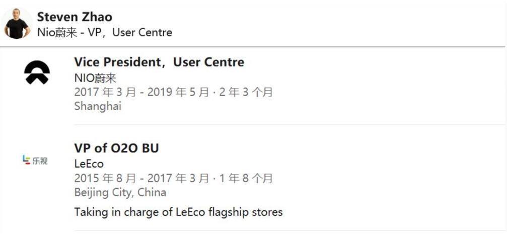 Zhao served as Vice President of User Center at Nio Automotive from March 2017 to May 2019, where he was responsible for the expansion of Nio HOUSE, exploring ways to maximize user benefits through branded experience stores.