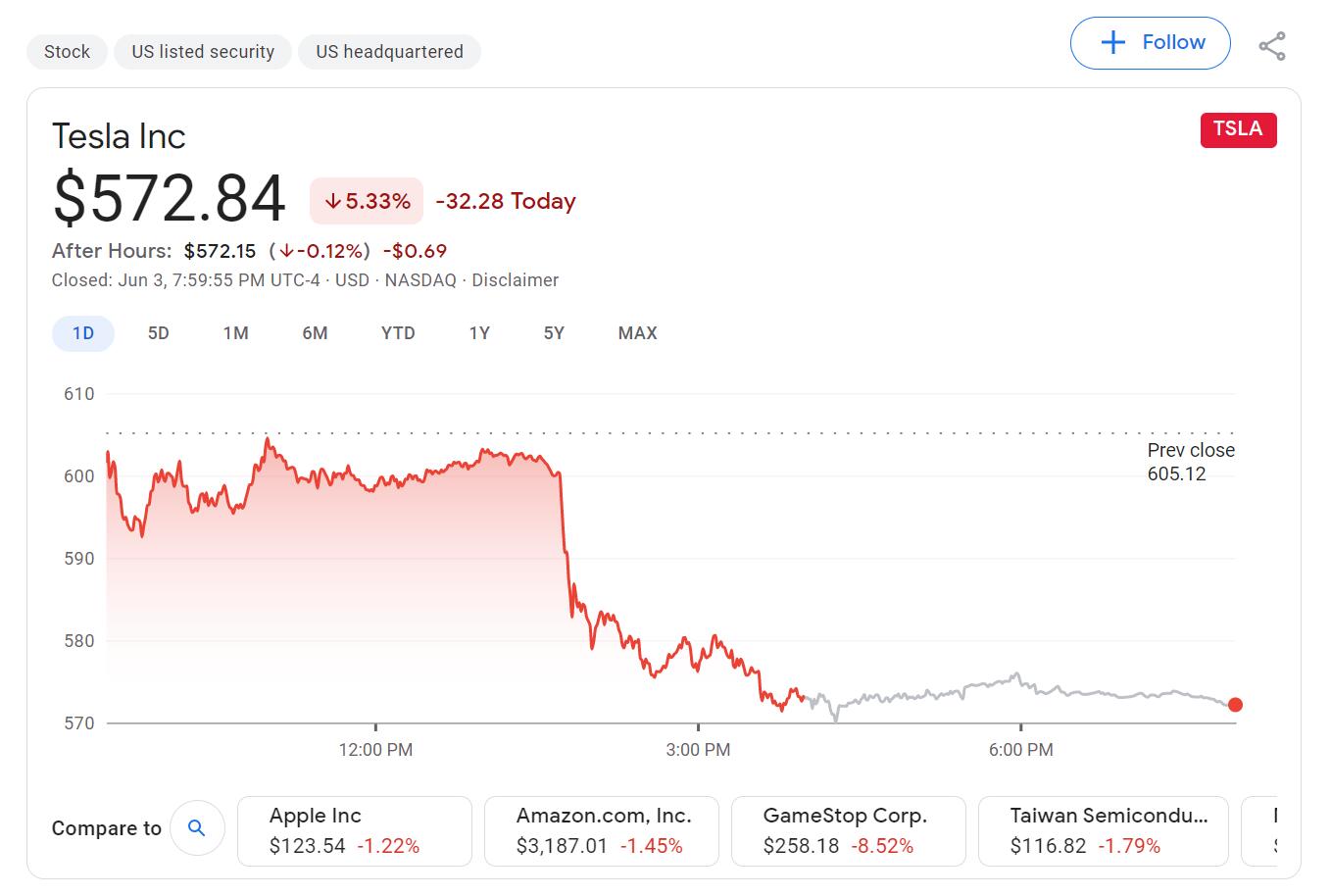 The report sent Tesla shares to plunge 5.33 percent to $572.84 Thursday.