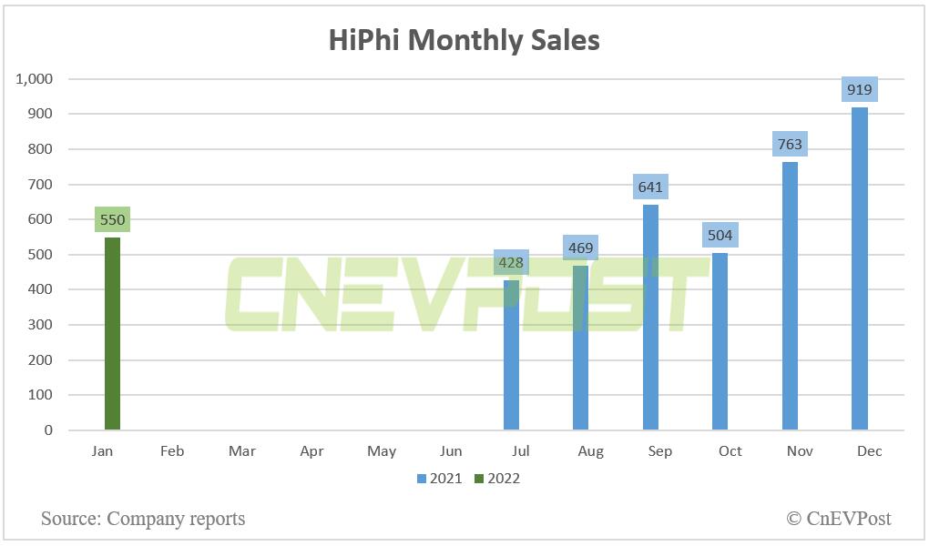 China's homegrown premium electric vehicle (EV) brand HiPhi sold 550 units of HiPhi X, its only model currently on sale, in January, down 40 percent from 919 units in December, according to data released today by the company.