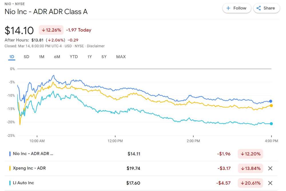 Nio fell 14.14 percent in Hong Kong and 12.26 percent in the US on Monday. Xpeng fell 22.2 percent in Hong Kong and 13.79 percent in the US. Li Auto fell 19.6 percent in Hong Kong and 20.61 percent in the US.