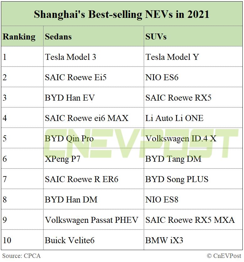 The CPCA also listed the most popular NEVs in Shanghai based on registrations in 2021, with the Tesla Model 3, SAIC Roewe Ei5 and BYD Han EV being the top-selling sedans, and the Tesla Model Y, Nio ES6 and Roewe RX5 being the top-selling SUVs.
