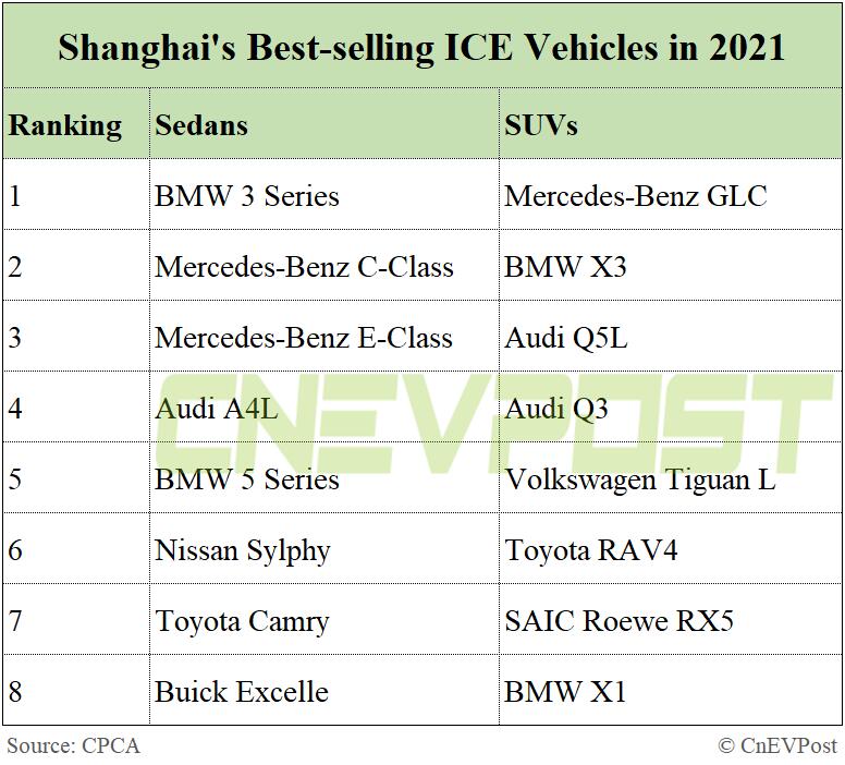BMW 3 Series, Mercedes-Benz C-Class, and Mercedes-Benz E-Class are the most registered fuel cars in Shanghai in 2021, while Mercedes-Benz GLC, BMW X3, and Audi Q5L are the most registered SUVs.