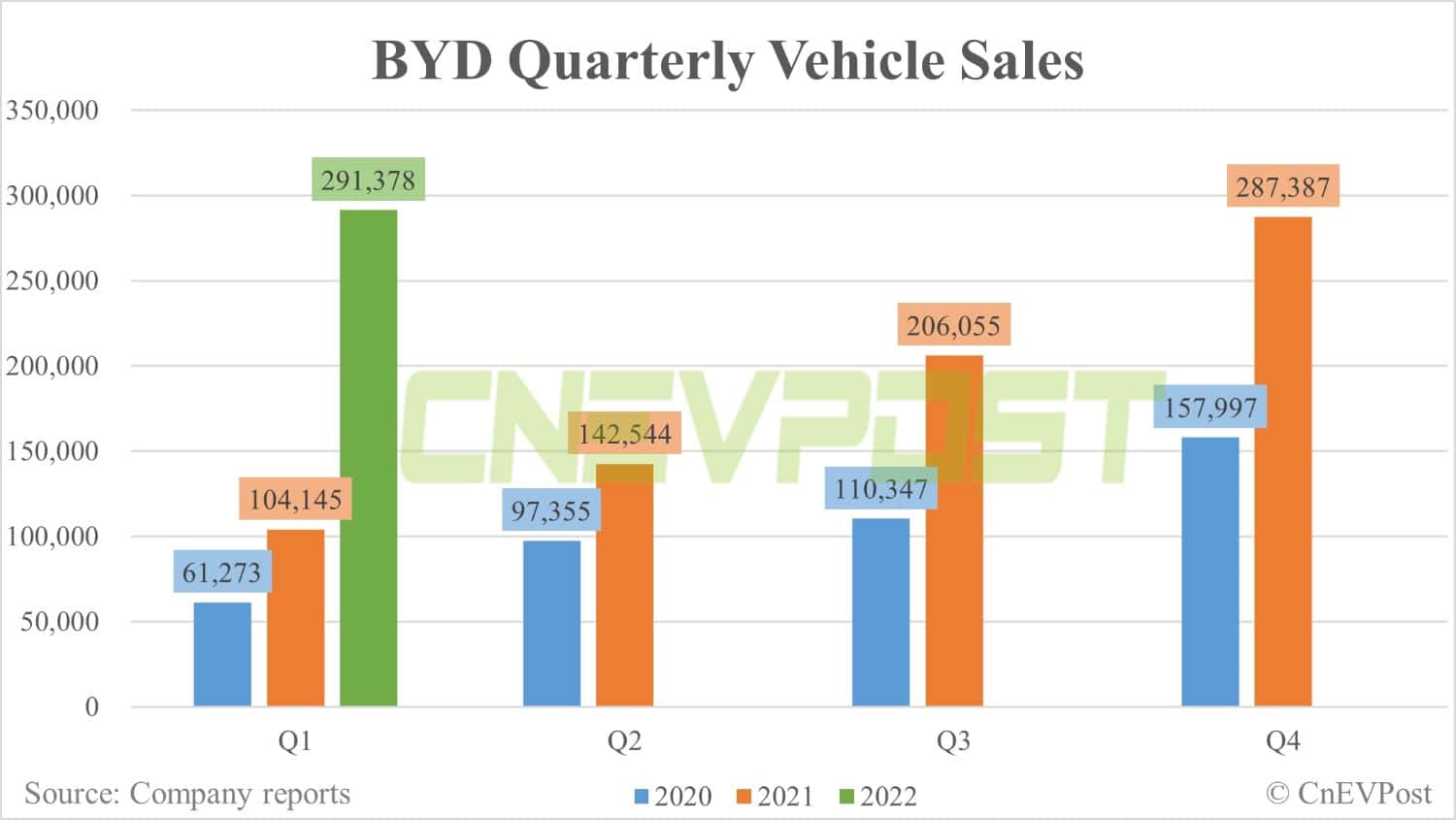 BYD sold 291,378 units of all vehicles in the first quarter, up 180 percent year-on-year. Among them, sales of NEVs were 285,000 units, up 423 percent year-on-year.