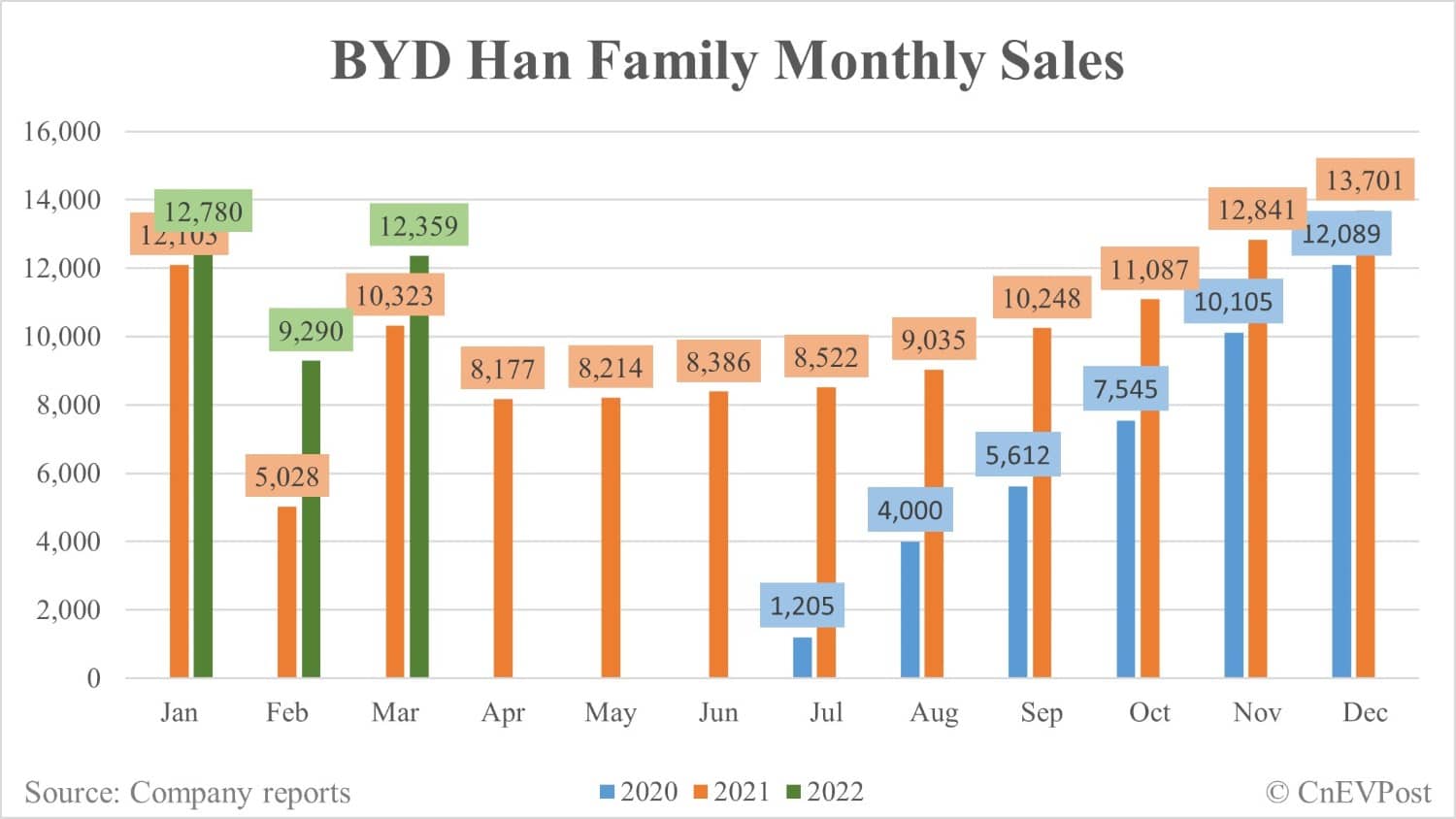 Cumulative sales of Han family models since their launch were 192,650 units at the end of March, data monitored by CnEVPost showed.