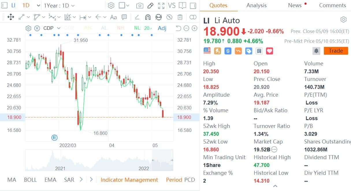 At press time, Li Auto was up 4.66 percent to $19.78 in pre-market trading.