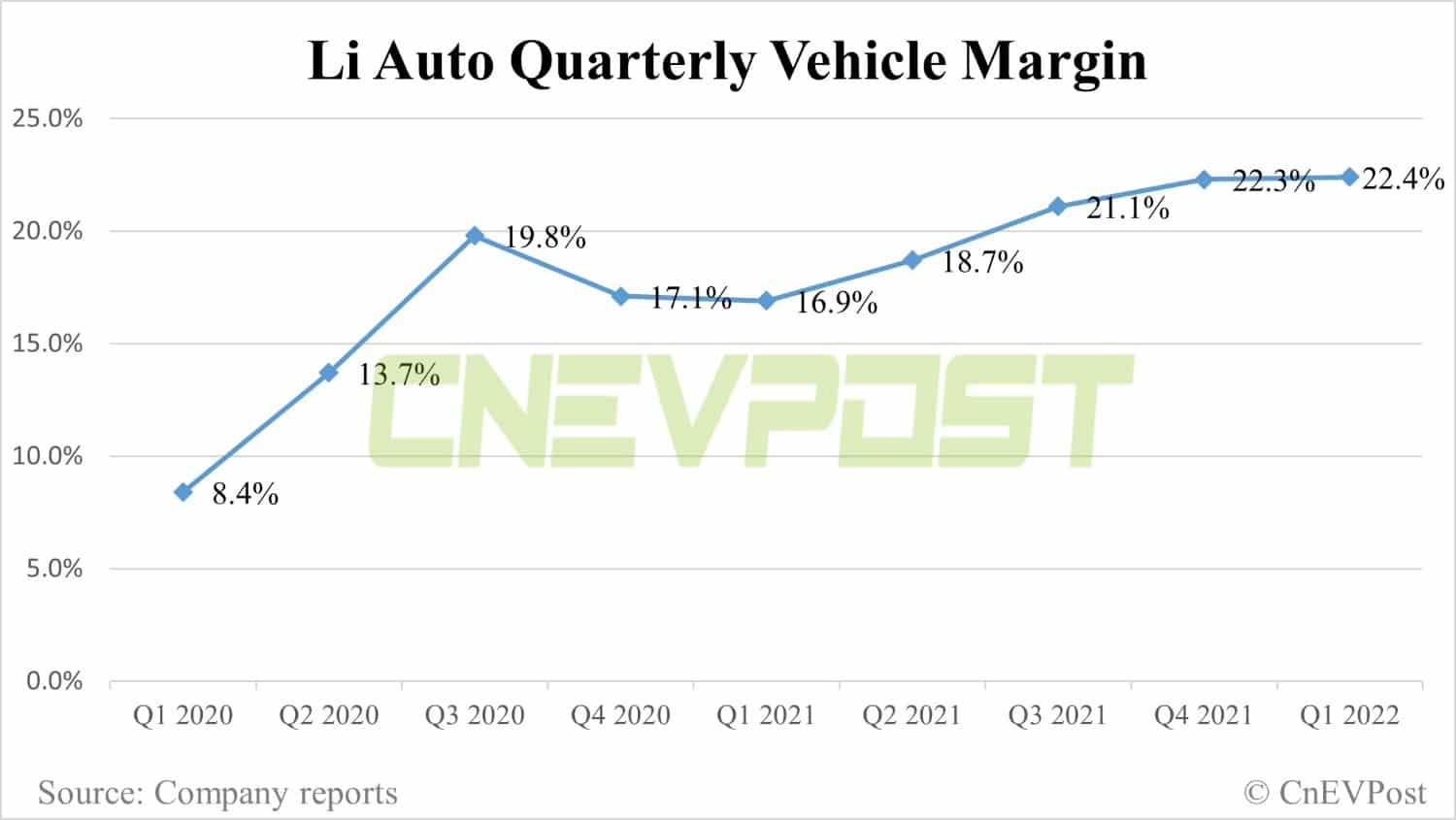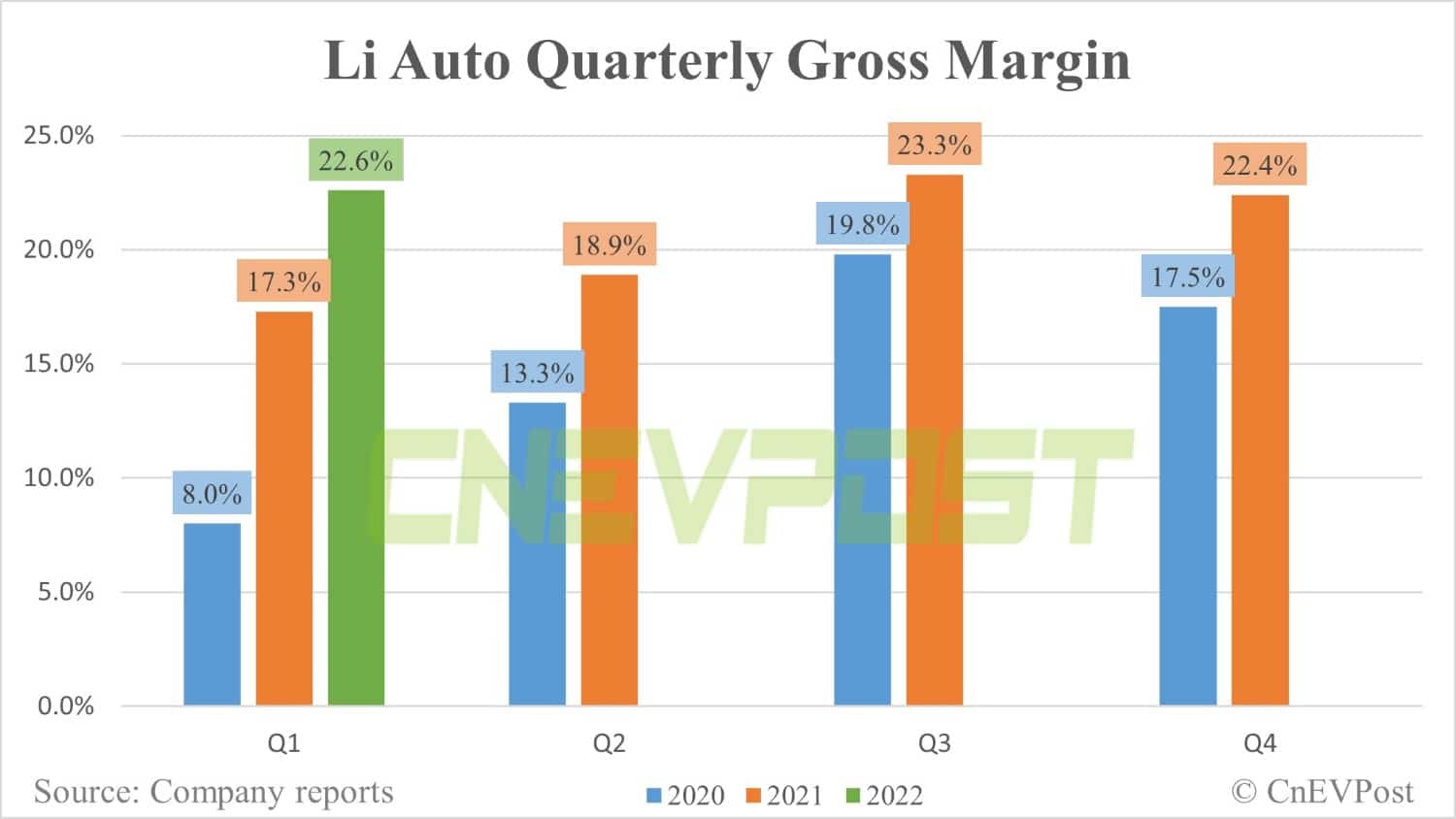 Li Auto reported a gross margin of 22.6 percent in the first quarter, up from 22.4 percent in the fourth quarter and up from 17.3 percent in the same quarter last year.