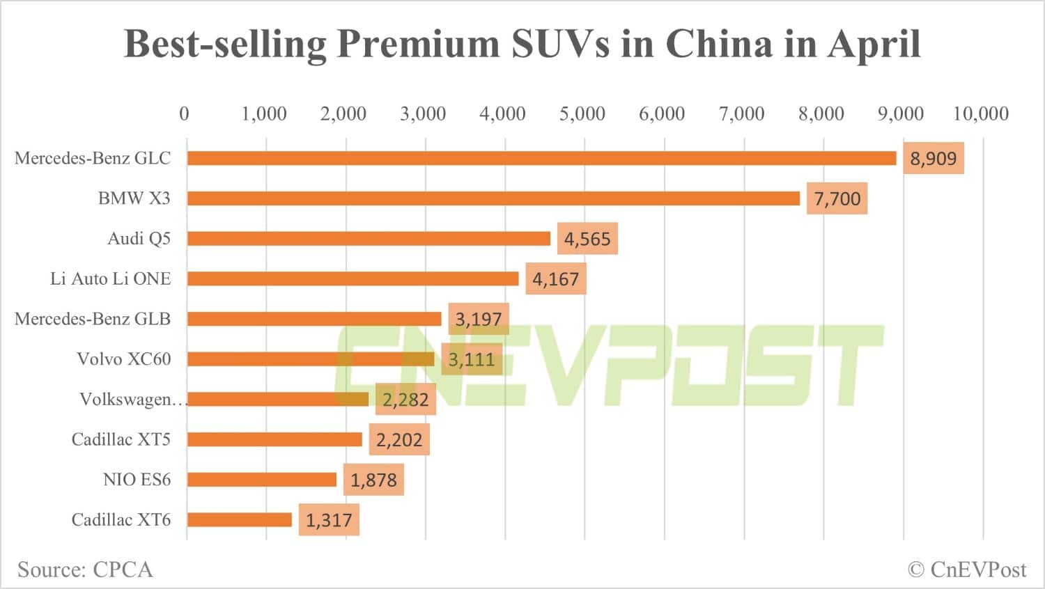 In April, the Mercedes-Benz GLC was the best-selling premium SUV, with 8,909 units sold, down 41.3 percent year on year.