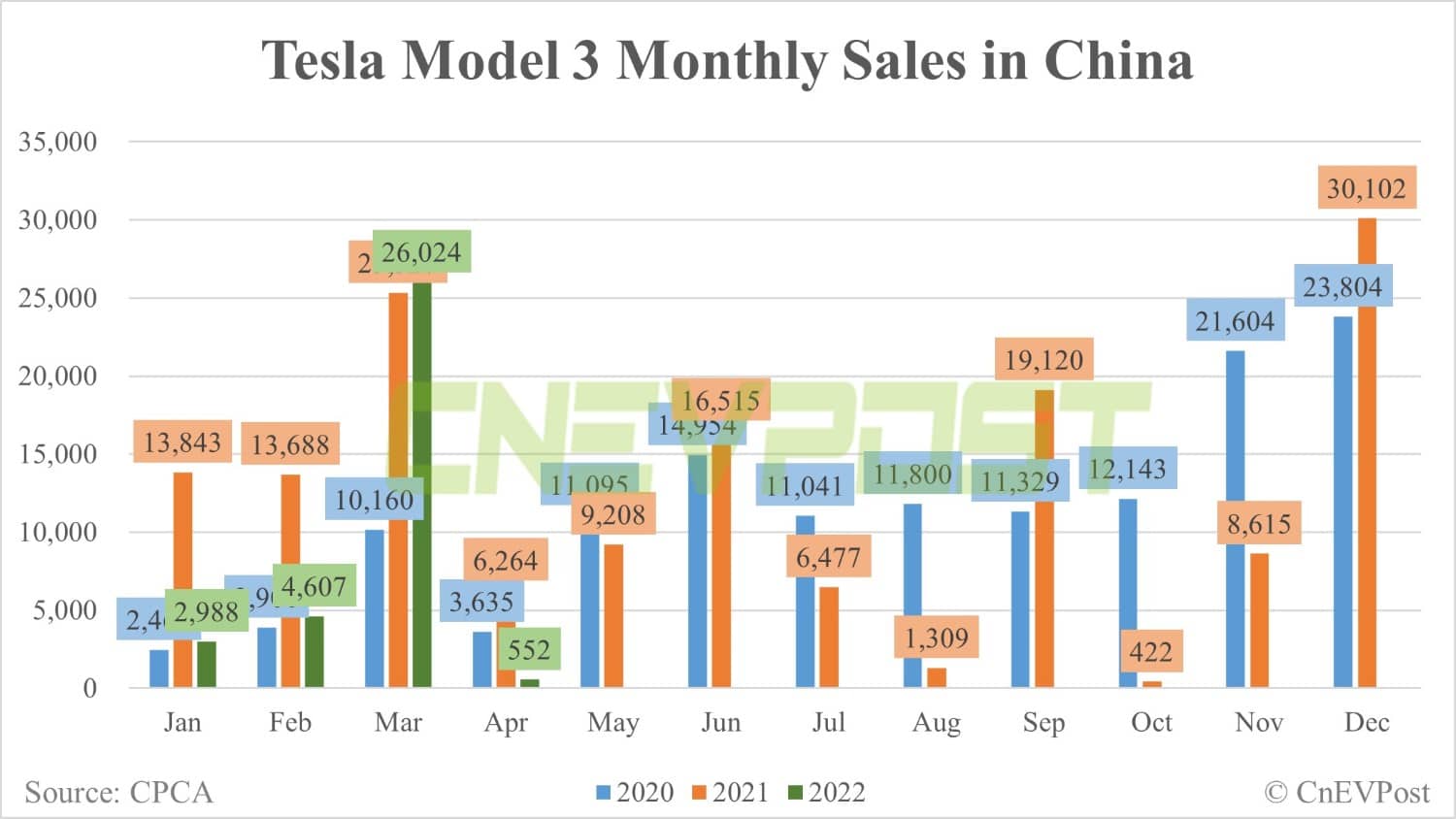 Back at Tesla, Model 3 retail sales in China from January to April were 34,171 units, making it the sixth best-selling new energy sedan for the period, data released today by the CPCA shows.