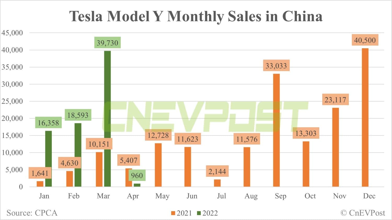 Tesla Model Y sales in China were 960 units in April, down 98 percent from 39,730 units in March.
