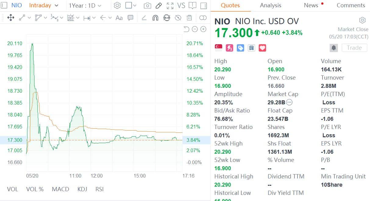Nio opened at S$16.9 in Singapore and rose 20 percent at one point during the day. It rose 3.84 percent to S$17.3 by the close of trading.