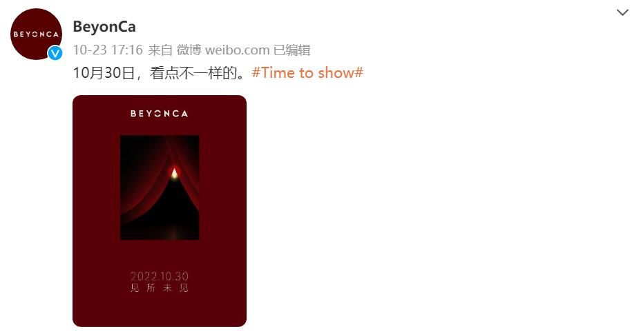 BeyonCa has published three Weibo posts in a week to warm up the event, the first of which was posted on October 23, saying "On October 30, you can see something different. #Time to show". This was also the first content on its Weibo account.