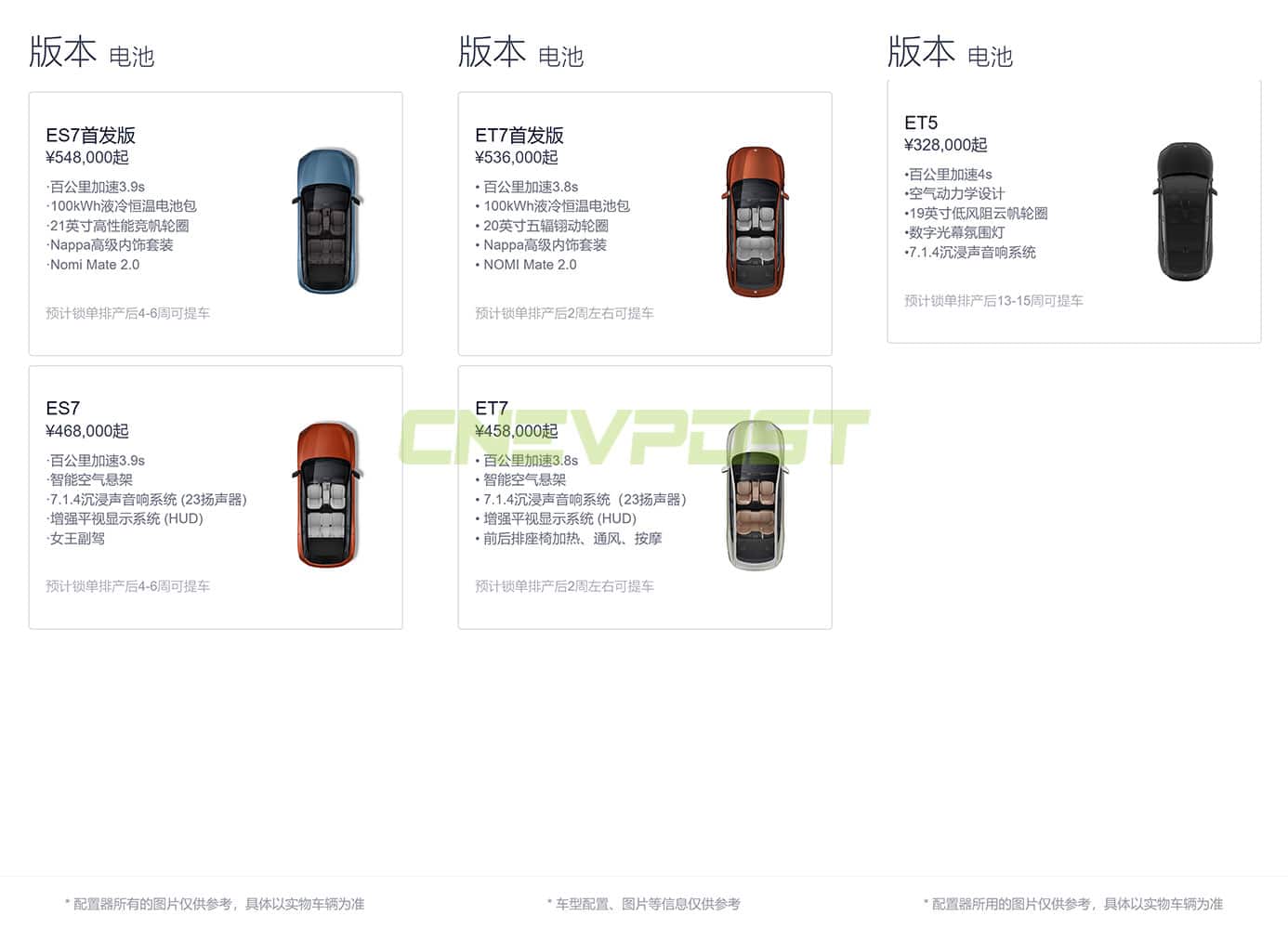 The ET7 currently has a wait time of about 2 weeks, and ES7 currently has a wait time of 4-6 weeks, the same as previously.