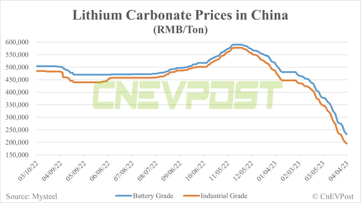 After that, lithium carbonate continued to fall sharply, with the price of battery-grade lithium carbonate and industrial-grade lithium carbonate falling 5.10 percent and 4.88 percent, respectively, on April 3, both the largest single-day declines of the year.