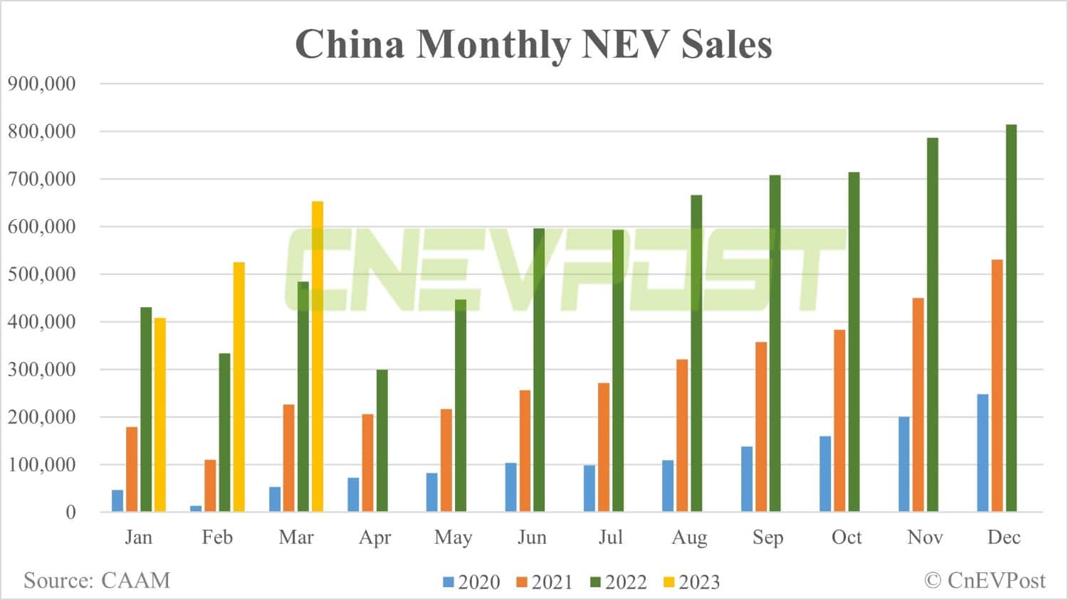 Production of NEVs in China was 674,000 units in March, up 44.8 percent year-on-year and up 22.1 percent from February.