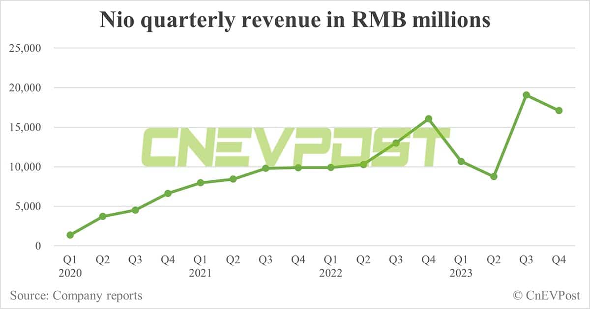 The electric vehicle (EV) maker reported revenue of RMB 17.1 billion ($2.4 billion) in the fourth quarter of 2023, up 6.5 percent from the fourth quarter of 2022 while down 10.3 percent from the third quarter of 2023, according to its unaudited financial results released today.