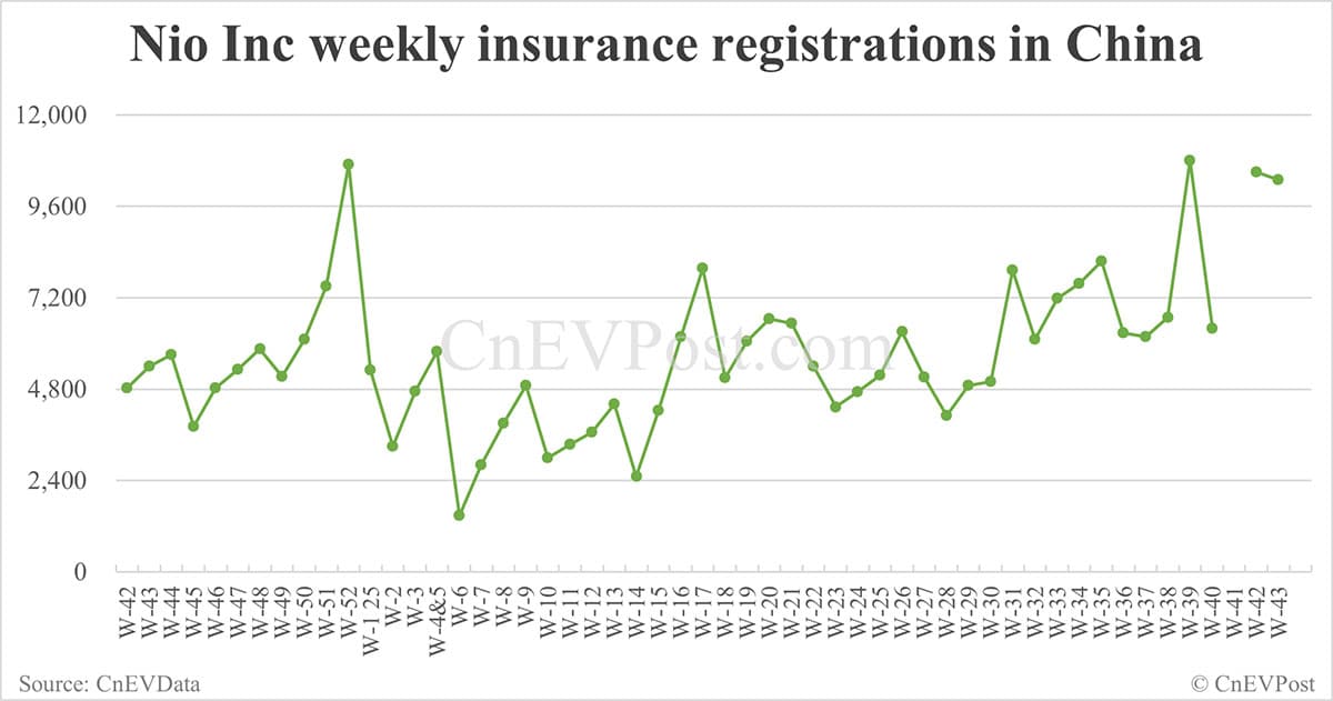 For the week ending October 19, Nio Inc delivered 10,500 vehicles, comprising over 4,000 Nio-branded cars, more than 5,000 Onvo cars, and over 1,500 Firefly units.