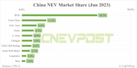Automakers' share in China NEV market in Jun: BYD 34.7%, Tesla 11.2%