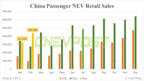 China's Feb retail sales of passenger NEVs up 32% from Jan to 438,000, preliminary CPCA data show